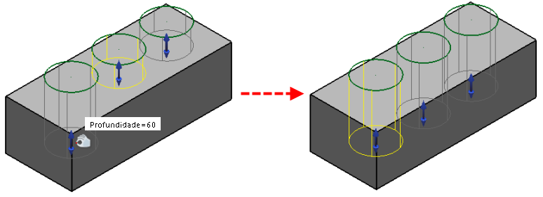 Você também pode ajustar a profundidade utilizando a alça. Se você estiver criando um corte sólido utilizando mais de um modelo de arames, arrastar a alça de um sólido de extrusão irá alterar os comprimentos de todos os sólidos de extrusão. O valor da Profundidade no diálogo é atualizado para refletir a alteração.