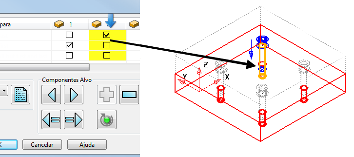 Clicar numa linha, coluna ou célula irá destacar os componentes e figuras relevantes na janela gráfica principal como segue: