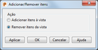 Remover itens da vista — Selecione itens na vista e então selecione esta opção para remover os itens da vista. Os itens são marcados quando eles são removidos, de maneira que possam ser adicionados novamente. Selecione a opção Adicionar itens à vista para adicionar os itens de volta à vista.