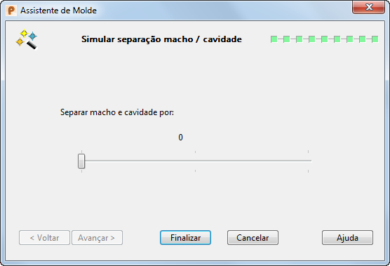 A página Simular separação macho/cavidade exibe o modelo no modo de sombreamento atual, em vez de no modo de modelo de arames.