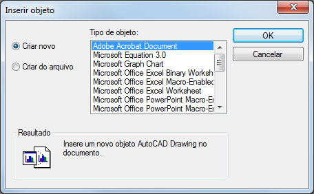 A lista Tipo de objeto contém todos os tipos de objetos que podem ser inseridos no desenho.
