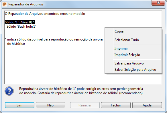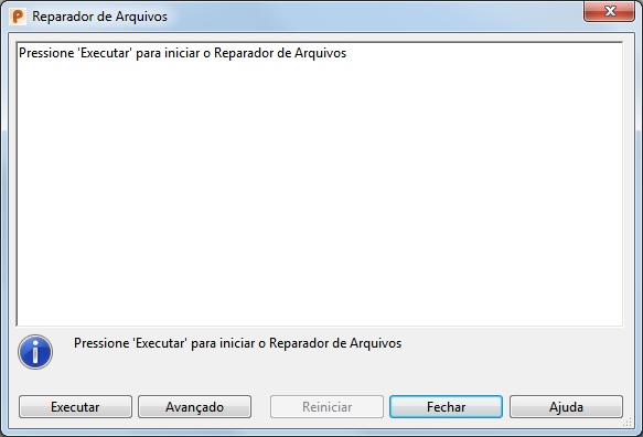 Aviso: O Reparador de Arquivos contém ferramentas avançadas. Caso seja utilizado incorretamente, sérios danos podem ser causados ao seu modelo ou à sua base de dados compartilhada. Consulte o suporte técnico antes de utilizar o Reparador de Arquivos na base de dados compartilhada e sempre crie um backup completo do sistema antes de continuar. Certifique-se de possuir cópias back-up ou duplicações antes de utilizar o Reparador de Arquivos em modelos.