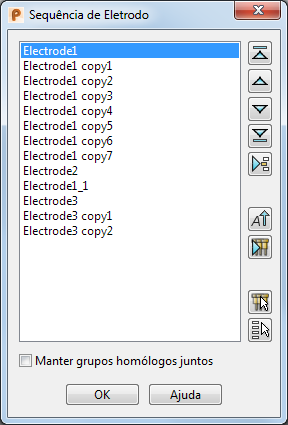 Agrupar homólogos — Posiciona cópias de eletrodos diretamente após o primeiro eletrodo do grupo homólogo na lista. Caso existam eletrodos selecionados na lista, apenas os grupos homólogos aos quais os eletrodos selecionados pertencem são agrupados.