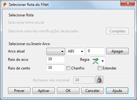 Quando esse diálogo é aberto, linhas candidatas são exibidas para auxiliar na determinação da rota de fillet.