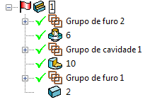 No exemplo, todos os furos próximos uns dos outros na árvore de sólido são colocados no mesmo grupo.