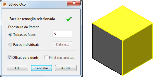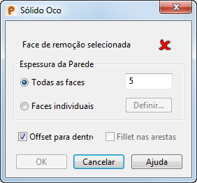 - Utilize a caixa de diálogo para remover uma face de um sólido e aplicar offset para criar um sólido oco.