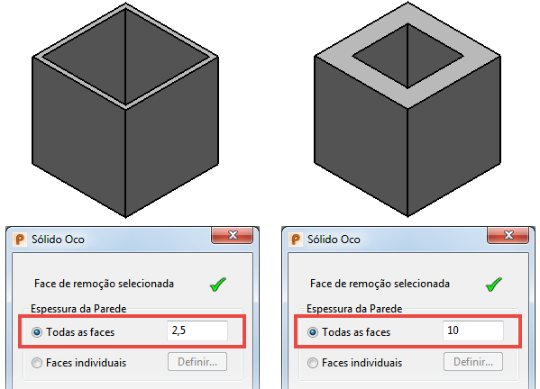 Ao criar um sólido oco (geralmente chamado de sólido 'concha' pois a parede fina é como uma concha), as faces de um sólido são removidas e as cópias das outras faces são espessuradas para criar uma parede sólida.