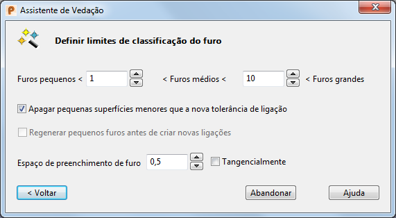 — Utilize as setas para cima e para baixo para definir o tamanho máximo permitido do espaço na fronteira de qualquer furo preenchido.