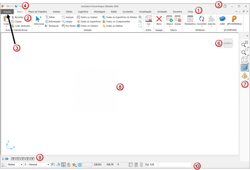 PowerShape utiliza uma interface em estilo Windows que consiste numa faixa de opções com guias. As áreas da tela são identificadas como segue: