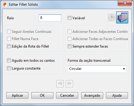 - Transformar o fillet de raio variável num fillet de raio constante. Desmarque a opção Variável e insira um novo valor na caixa Raio.