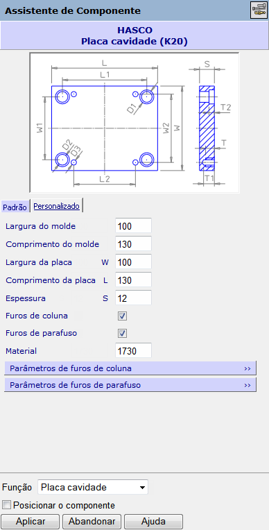 Utilize as opções como Largura da placa, Comprimento da placa e Espessura para alterar as dimensões. Os exatos parâmetros exibidos na guia Personalizado refletem o tipo de componente sendo definido.
