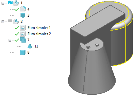 As operações de divisão produzem sólidos desconectados com árvores de histórico copiadas (com a adição da figura Booleana superior). O exemplo abaixo mostra dois sólidos:
