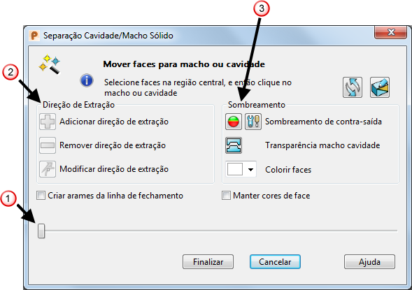 Remover direção de extração — Clique nesse botão para remover a direção de extração selecionada. Qualquer face que esteja sendo extraída ao longo dessa direção de extração ficará ambígua.
