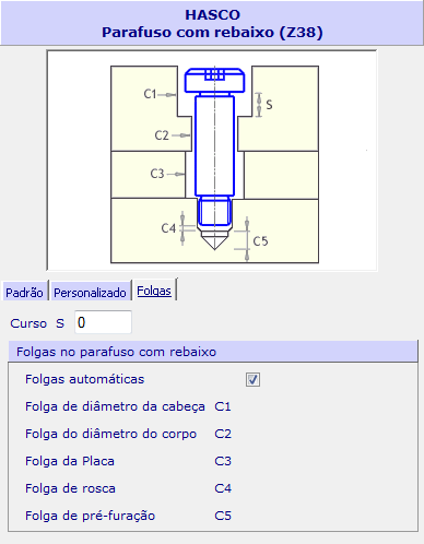 A guia Folgas exibe os parâmetros necessários para componentes como colunas guia, pinos extratores, parafusos, buchas de injeção, coluna suporte e cavilhas. Os parâmetros exibidos são específicos para o tipo de componente que você está criando.