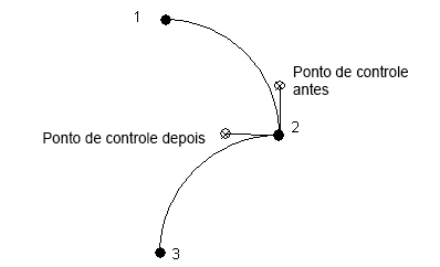 Cada ponto em uma curva tem pelo menos dois pontos de controle: um para a curva entrando no ponto e outro para a curva saindo dele. Na curva a seguir, os pontos de controle são mostrados para o ponto 2.