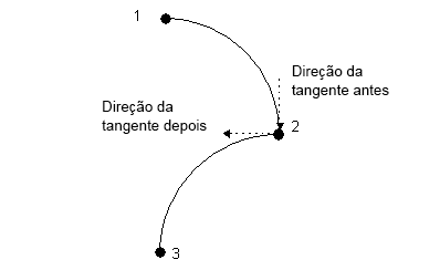 Você pode configurar as direções das tangentes antes de depois do ponto independentemente ou ambas juntas. Se ambas forem definidas, a curva será suave em relação às tangentes nesse ponto. A figura abaixo mostra um exemplo onde a direção da tangente antes é igual à direção da tangente depois no ponto 2.