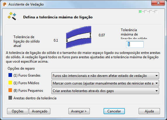 Avançado — Clique neste botão para acessar a página Regenerar furos no sólido, na qual é possível definir valores específicos nas opções para preenchimento de furos.