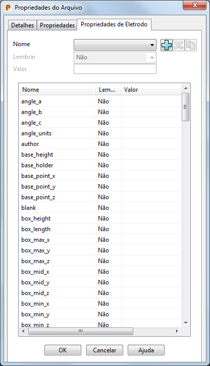 Lembrar — Selecione SimouNão na lista suspensa. Se você selecionar Sim, o valor para essa propriedade será inserido automaticamente na caixa de diálogo Detalhes Adicionais do Eletrodo.