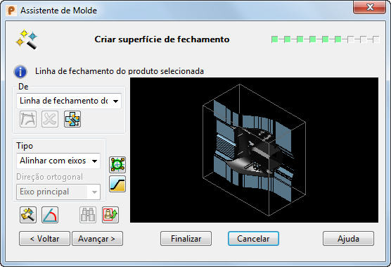 — Se a opção Curva Composta Alternativa estiver selecionada na lista suspensa, ela servirá para criar uma curva alternativa, que será usada ao criar a superfície de fechamento. Isso significa que você pode criar uma superfície de fechamento parcial e então utilizar o assistente para criar a porção restante. Selecionar esta opção oculta automaticamente o bloco e o produto a fim de facilitar o traçado da curva.
