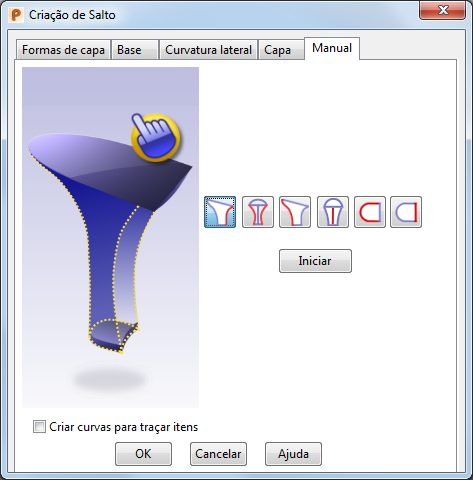 Frontal da capa — Selecione esta opção para editar a curva frontal da capa do salto. Quando você clica em Início, a vista é alterada para Vista inferior.