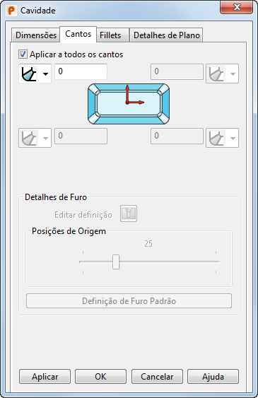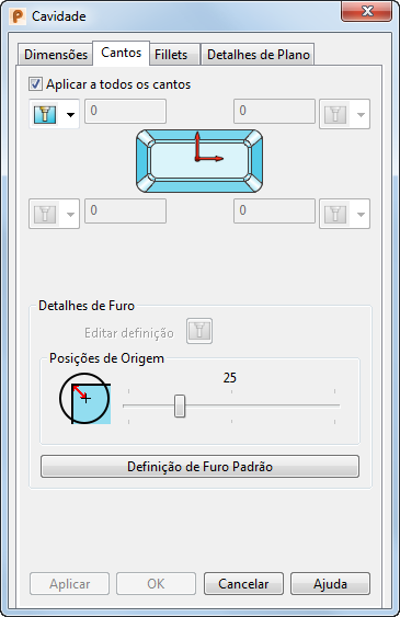 — Crie um furo de canto. Quando você seleciona esta opção, a seção Detalhes de Furo do diálogo torna-se ativa permitindo definir o tamanho, tipo e posição do furo. Você só pode criar um canto com furo se estiver definindo uma cavidade.Detalhes de Furo — Se você criou um ou mais cantos de uma cavidade como um furo, pode definir o tamanho e a posição utilizando estaseção da página Cantos.