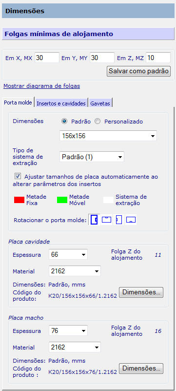 Use a página Dimensões para definir os insertos ou cavidades nas placas cavidade e macho.