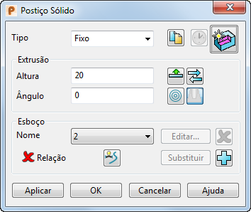 para exibir o diálogo Relação de Figura Sólida. Isso permite que a posição da figura seja especificada com relação ao sólido. O estado atual da Relação é indicado por uma das opções a seguir: