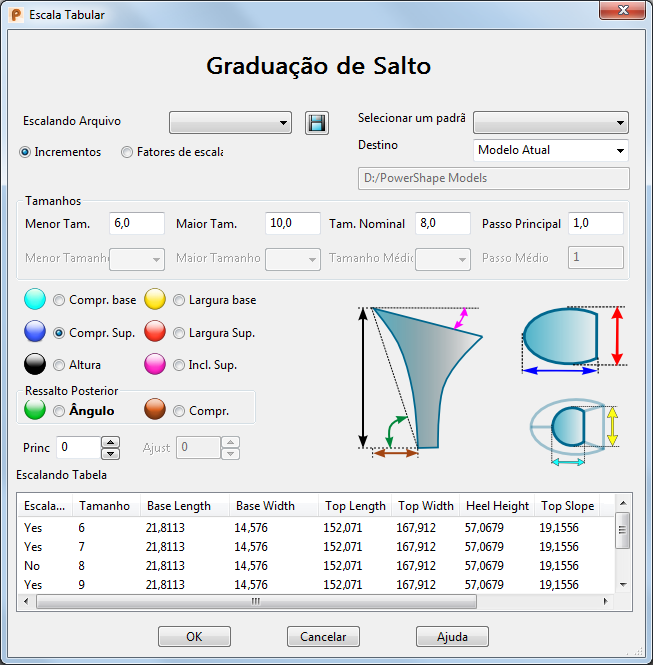 - Fatores de escala para especificar o incrementopor fatores de escala em relação ao Tamanho Nominal do calçado.