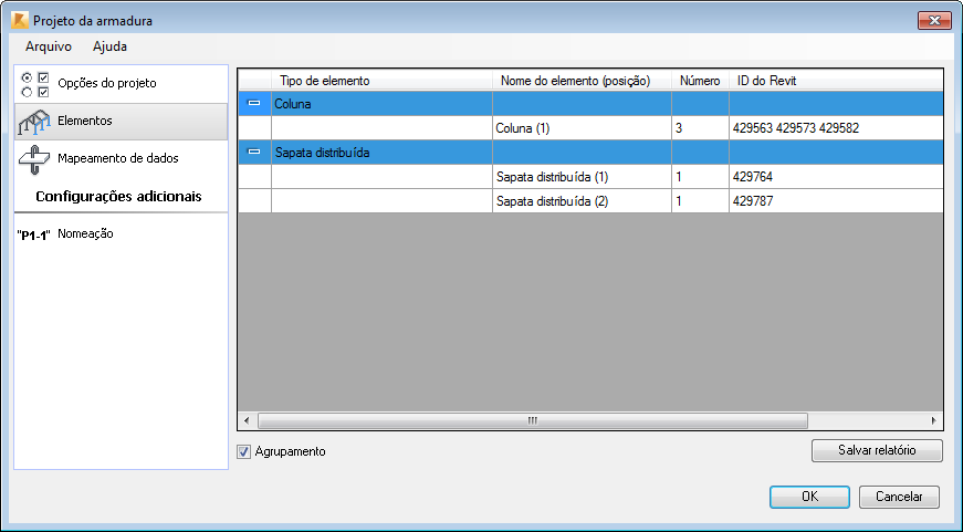 A guia Elementos exibe uma lista de elementos selecionados compatíveis com a extensão (vigas de concreto, colunas e sapatas distribuídas). Os elementos são agrupadas de acordo com seu tipo (3 grupos principais: Vigas, Colunas e Sapatas distribuídas), o parâmetro Marca da instância de família do Revit, elemento da geometria (comprimento, forma do corte cotas) e parâmetros de armadura. Também é possível anular a opção Agrupamento. A seguir, todos os elementos são considerados separadamente e o número dos projetos do Robot é igual ao número de elementos selecionados no Revit.