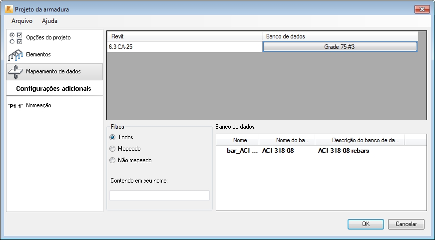 Para alterar o vergalhão atribuído, clique no botão na direita - lado da tabela. Uma caixa de diálogo adicional de seleção é aberta, selecione o vergalhão que deve ser atribuído do banco de dados.