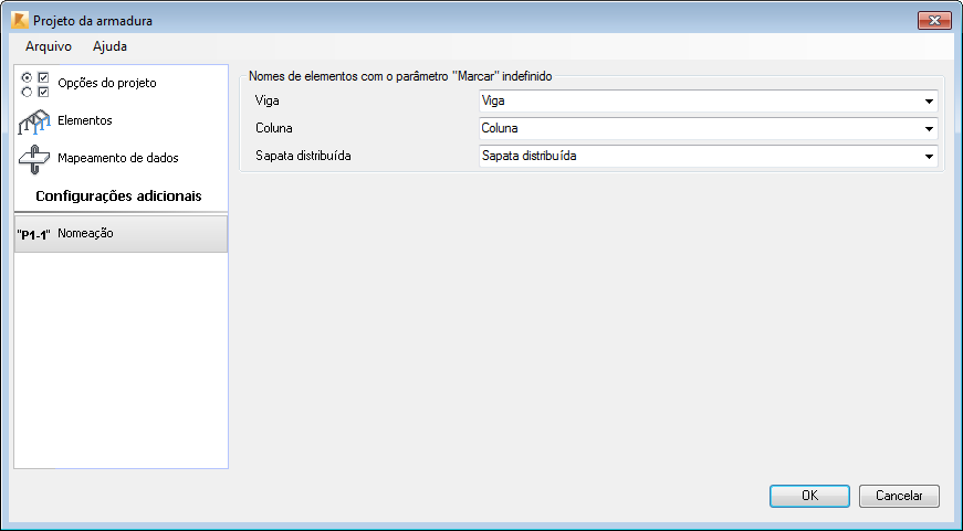 A guia Nomeação está disponível para os modos de projetar e verificar. Isto se aplica somente para os elementos para os quais o parâmetro Marca não está definido. Utilize-a para definir um prefixo para o nome para elementos RC do Robot.