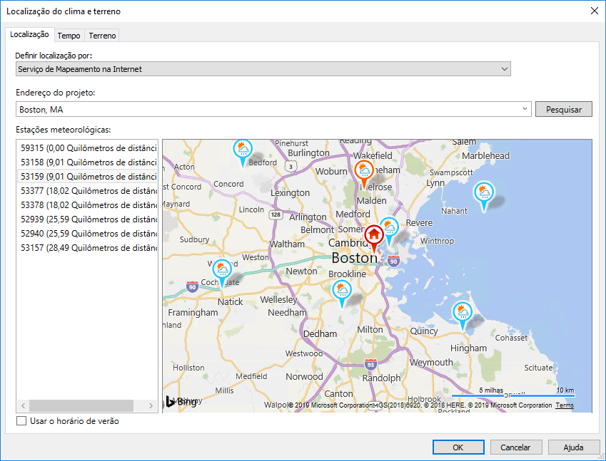 As estações climáticas disponíveis são exibidas no mapa e na lista à esquerda. Em geral, você deve escolher uma estação climática mais próxima à sua localização. No entanto, você pode desejar selecionar uma estação climática próxima cuja elevação e recursos de terra ou água melhor refletem a localização do modelo.