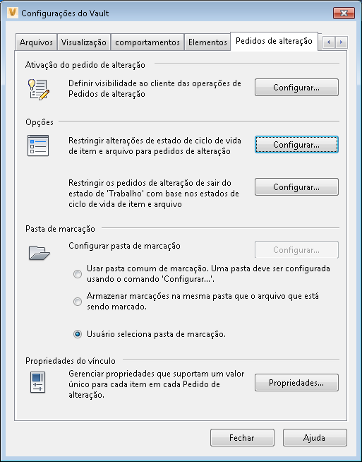 Configurações do Vault. A guia Pedidos de Alteração contém opções para restringir as alterações de itens, alterar pedidos dependendo do ciclo de vida ou estado, configurar a pasta de marcação, gerenciar propriedades no link pedidos de alteração e definir esquemas de numeração do pedido de alteração. Também é possível desativar o recurso ordens de alteração.