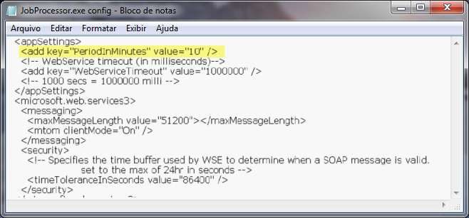 - Edite a linha que possui <add key="PeriodInMinutes value="10"/> para o tempo desejado. O tempo pode ser definido para um valor fracionário, como 0,1 para 6 segundos ou 1,5 para 90 segundos.
