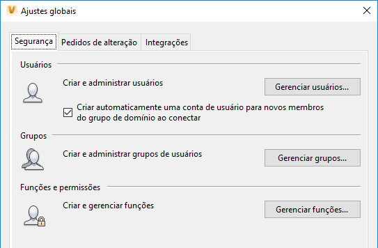 Também é possível criar grupos de usuários e lhes atribuir privilégios de acesso e funções para os grupos. As funções atribuídas a um usuário ou a um grupo definem as permissões do usuário ou dos membros do grupo.