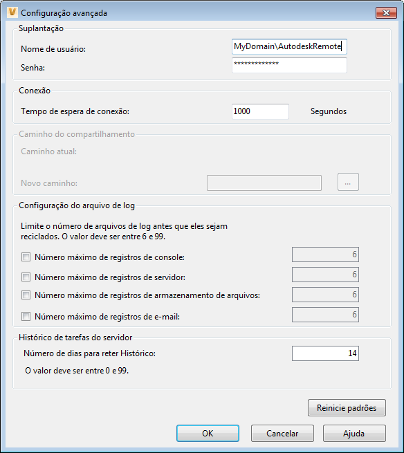 - Na caixa de diálogo Configurações Avançadas, altere o Nome do Usuário para MyDomain\AutodeskRemote e insira a senha correspondente.