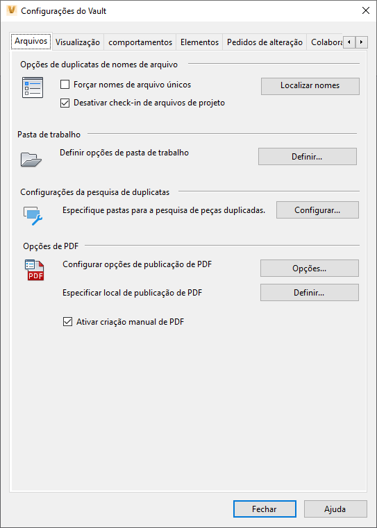 A guia Arquivos na caixa de diálogos Configurações do Vault contém opções para definir nomes exclusivos de arquivos, desativar o check-in de arquivos de projeto, especificar as opções de pasta de trabalho e localizar duplicatas.