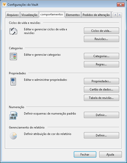 A guia Comportamentos na caixa de diálogo Configurações do Vault contém opções para editar as definições de ciclo de vida e gerenciar revisões, administrar categorias e regras, criar e modificar propriedades, definir esquemas de numeração personalizados e atribuir cores em relatórios.