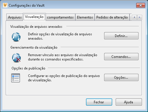A guia Visualização na caixa de diálogo Configurações do Vault contém as opções para configurar anexos de visualização, gerenciar arquivos de visualização e definir as configurações de publicação.