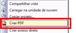 Clique com o botão direito do mouse e selecione Criar PDF. Ou selecione o comando no menu Ações. IMPORTANTE: o comando Criar PDF está disponível somente para a versão mais recente do arquivo e não para qualquer versão/revisão histórica dos arquivos CAD 2D.