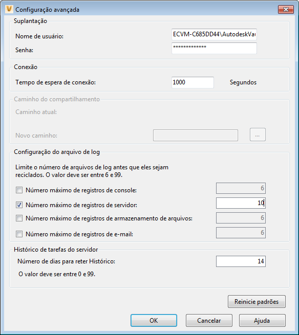 Configure credenciais para usar ID diferente, limites de tempo de espera, caminhos de compartilhamento e preferências de arquivo de registro na caixa de diálogo Configurações avançadas.