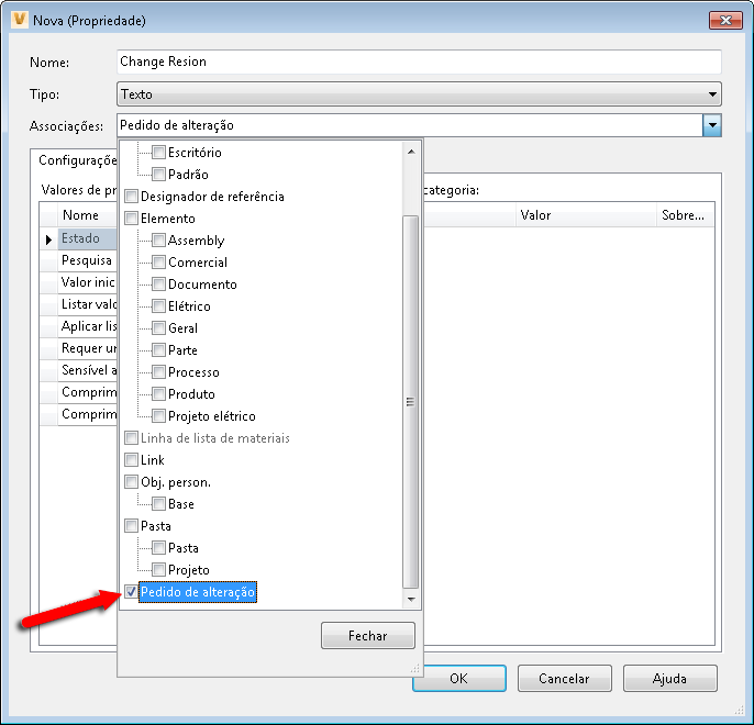 As propriedades definidas pelo usuário para os pedidos de alteração podem ser criadas na caixa de diálogo Definições da propriedade.