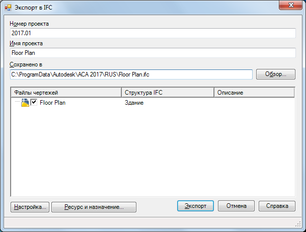 Данная процедура используется для экспорта чертежа без внешних ссылок в файл IFC. При экспорте необходимо активизировать соответствующий чертеж. По умолчанию он сопоставляется с (Ifc)Building.