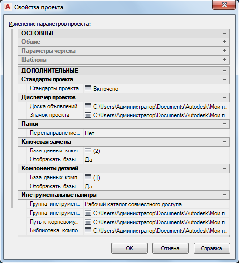 Имеется возможность определения или изменения дополнительных свойств проекта, таких как стандарты, изображения, ключевые заметки, компоненты деталей и инструментальные палитры.
