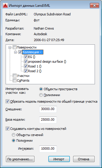 - В диалоговом окне "Импорт данных LandXML" выберите параметры импорта.