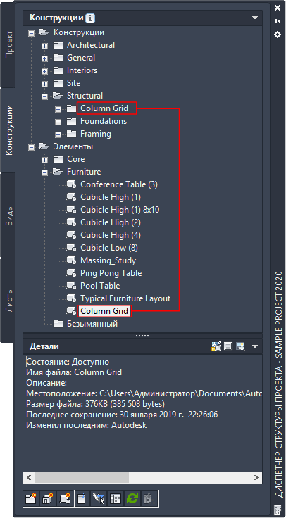 - Не следует перетаскивать конструкцию в папку "Элементы" с помощью Проводника Windows. Это приведет к рассогласованию данных проекта.