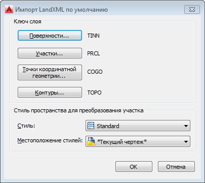 Если для LandXML данных не определены ключи слоев, импортируемые данные размещаются в стандартных ключах слоев, заданных для данных LandXML, TINN (Поверхности), PRCL (Участки), COGO (Точки COGO) и TOPO (Контуры).