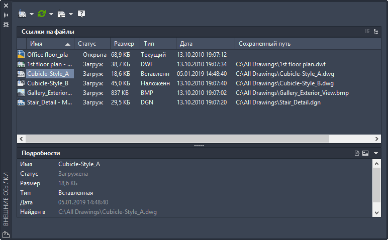 Отображение списка ссылок в текущем чертеже, включая такие сведения, как статус, размер и дата создания.