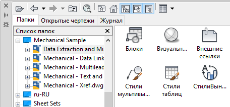 Вкладки «Папки», «Открытые чертежи» и «Журнал» обеспечивают различные способы доступа к содержимому.