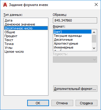 Отображение списка подходящих форматов для выбранного типа данных. Например, если выбран тип данных "Углы", список форматов включает в себя "Десятичные градусы", "Грады", "Радианы", и т. д.